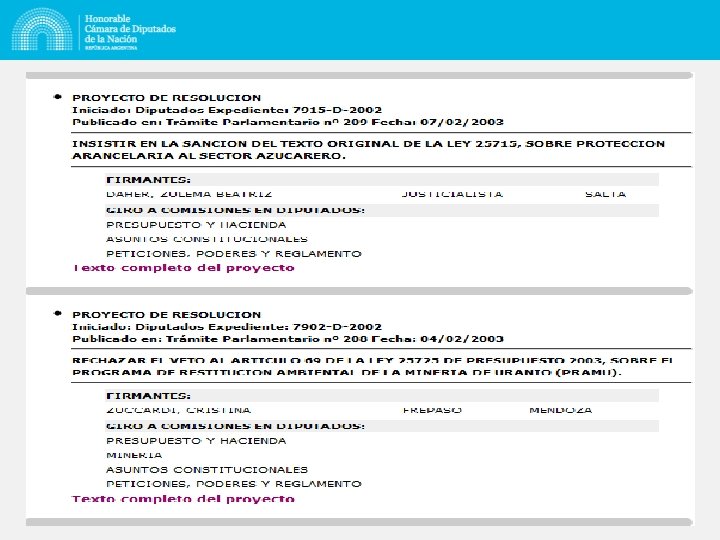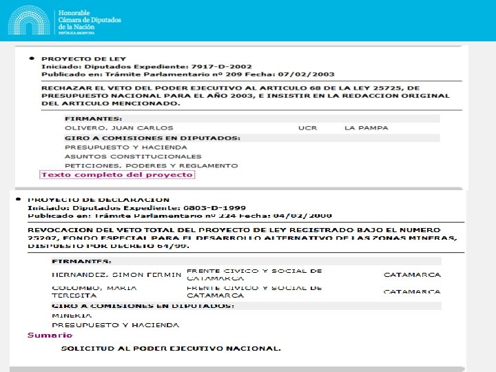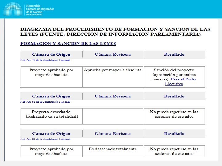 EL VETO DE LAS LEYES Art. 83. (CN): Desechado en el todo o en parte un proyecto por el Poder Ejecutivo, vuelve con sus objeciones a la Cámara de su origen; ésta lo discute de nuevo, y si lo confirma por mayoría de dos tercios de votos, pasa otra vez a la Cámara de revisión. Si ambas Cámaras lo sancionan por igual mayoría, el proyecto es ley y pasa al Poder Ejecutivo para su promulgación. Las votaciones de ambas Cámaras serán en este caso nominales, por sí o por no; y tanto los nombres y fundamentos de los sufragantes, como las objeciones del Poder Ejecutivo, se publicarán inmediatamente por la prensa. Si las Cámaras difieren sobre las objeciones, el proyecto no podrá repetirse en las sesiones de aquel año. CADUCIDAD DE PROYECTOS VETADOS (ART. 3 LEY 13. 640) Los proyectos de ley o parte de ellos que el Poder Ejecutivo devuelva observados en uso de la facultad que le acuerda el artículo 72 (ACTUAL 83) de la Constitución Nacional, que el Congreso no confirme en el año parlamentario en que fueran devueltos o en el siguiente, se tendrán por caducados.