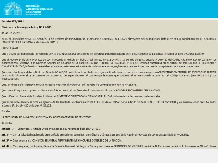 PROCEDIMIENTO EN LA COMISION BICAMERAL DE TRAMITE LEGISLATIVO OBJETO: regular el trámite y los alcances de la intervención del Congreso respecto de los decretos que dicta el Poder Ejecutivo: a) De necesidad y urgencia; b) Por delegación legislativa; c) De promulgación parcial de leyes. INTEGRACION: OCHO (8) diputados y OCHO (8) senadores, designados por el Presidente de sus respectivas Cámaras a propuesta de los bloques parlamentarios respetando la proporción de las representaciones políticas. Los integrantes de la CBP duran en el ejercicio de sus funciones hasta la siguiente renovación de la Cámara a la que pertenecen y pueden ser reelectos. Se elige anualmente un presidente, un vicepresidente y un secretario, los que pueden ser reelectos. La presidencia es alternativa y corresponde un año a cada Cámara. FUNCIONAMIENTO: La CBP cumple funciones aun durante el receso del Congreso de la Nación. Sesiona cuando cuenta con la presencia de la mayoría absoluta de sus miembros. Sus dictámenes se conforman con la firma de la mayoría absoluta de sus miembros y en caso de que haya más de un dictamen con igual número de firmas, el dictamen de mayoría es el que lleva la firma del presidente.