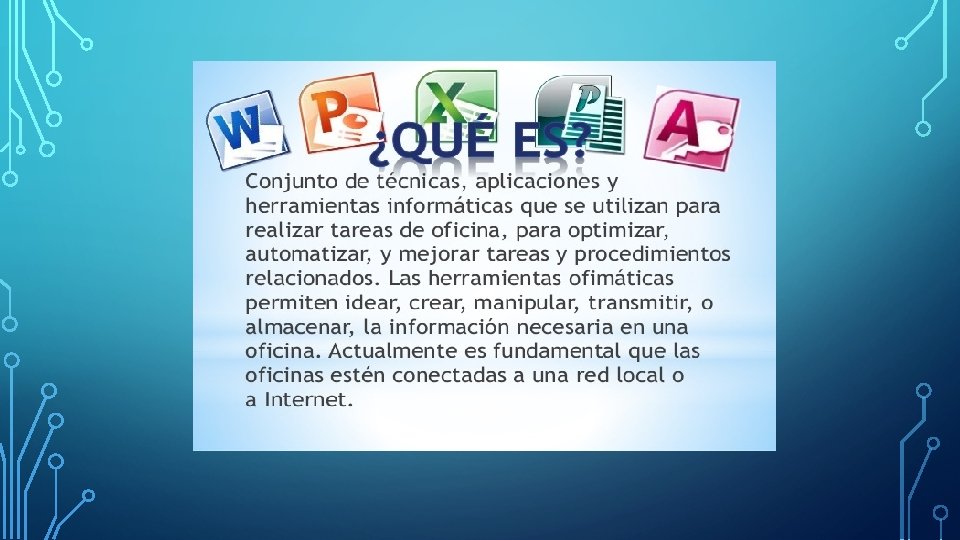 DESARROLLO ¿Que Es La Ofimatica? La ofimatica es el conjunto de metodos aplicaciones y herrramientas informaaticas que se usan en labores de oficina con el fin de perfeccionar, optimizar, mejorar el trabajo y operaciones relacionados. En referencia a lo anterior, la estructura Ofimatica abarca desde computadoras, impresoras, escáneres conectados mediante una red de área local hasta teléfonos y equipos de fax. Las herramientas o medios ofimaticos que permiten idear, elaborar, ceder, guardar todas las informaciones necesarias en una oficina.