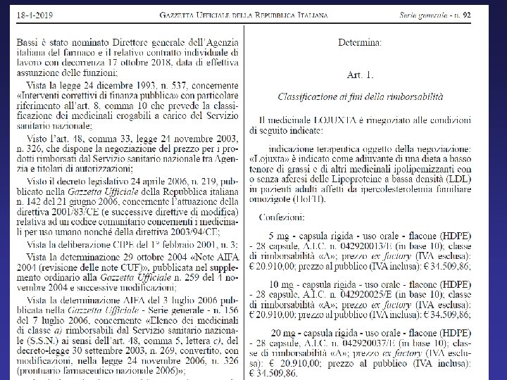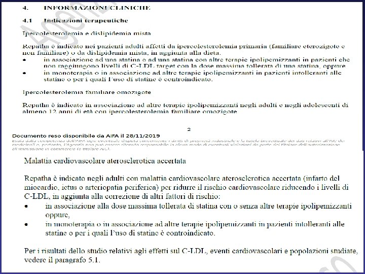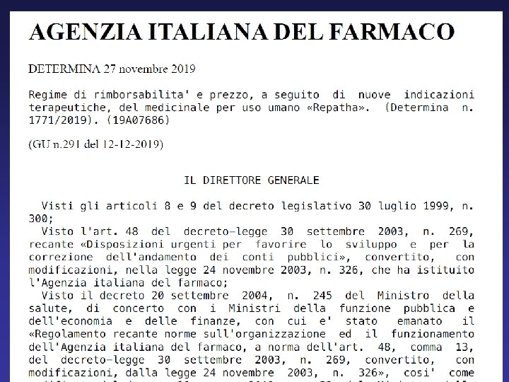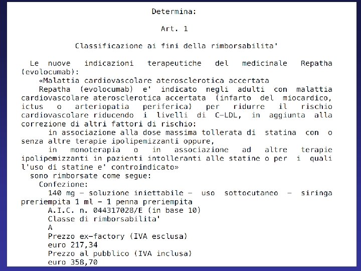 Con una determina pubblicata sulla GU n. 291 del 12/12/2019, l’Aifa ha reso più agevole la rimborsabilità di evolocumab garantendo una sorta di “fast track” per due tipologie di pazienti ad alto rischio cardiovascolare: i pazienti con infarto del miocardio recente (entro 12 mesi) e quelli con eventi cardiovascolari (Cv) multipli ricorrenti Per le popolazioni sopramenzionate, l‘aggiornamento dei criteri di rimborsabilità prevede una sola valutazione del profilo lipidico (LDL-C >100 mg/d. L nei 30 giorni che precedono l’inizio del trattamento con evolocumab) in linea con le indicazioni delle ultime linee guida Eas/Esc sulle dislipidemie che suggeriscono un approccio precoce ed aggressivo nei pazienti con Sca recente o eventi multipli In precedenza, per poter prescrivere il farmaco in questi pazienti occorrevano 3 valutazioni effettuate nel corso di 6 mesi che confermassero la persistenza dei livelli di colesterolo LDL sopra i 100 mg/d. L nonostante una terapia anticolesterolo di base ottimizzata (statina ad alta potenza alla massima dose tollerata + ezetimibe)