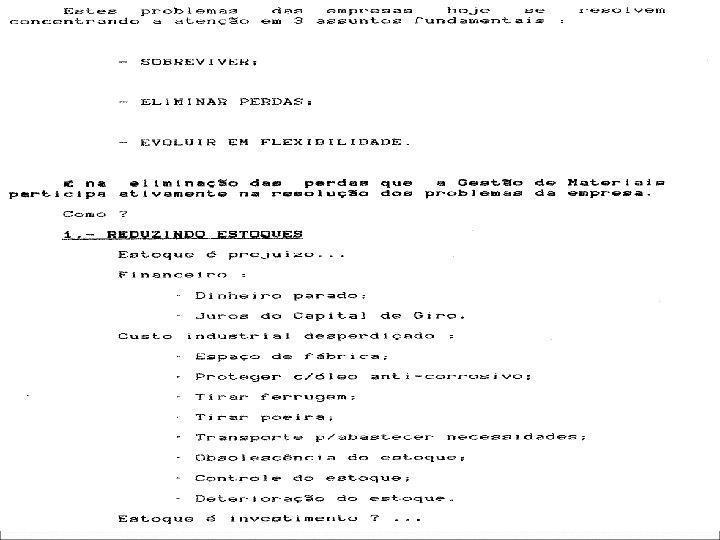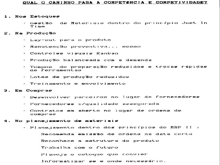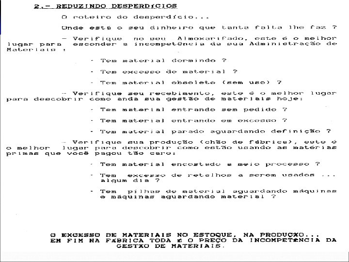 Custo Brasil dos Estoques Japão – Média de 7 dias de Estoques EUA – Média de 15 dias de Estoques Brasil – Média 30/45 dias de Estoques Exemplo: Consumo médio de 10 unidades/dia Custo de R$100, 00/unidade (só de material) Estoque Máximo: Japão – 7 x 10 = 70 x R$ 100, 00 = R$ 7. 000, 00 EUA – 15 x 10 = 150 x R$ 100, 00 = R$ 15. 000, 00 (114% +) Brasil – 45 x 10 = 450 x R$ 100, 00 = R$ 45. 000, 00 (200% +)(543% +) Sem custos de armazenagem, movimentação, etc.