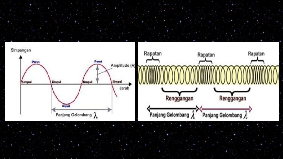 Macam-macam Gelombang Gel. Tali Mekanik (zat perantara) Gel. Permukaan Air Gel. Bunyi Medium Elektromagnetik (tanpa zat perantara) Gelombang Transfersal (arah rambatnya tegak lurus) Arah Rambatan Longitudinal (arah rambatnya sejajar) Gel. cahaya Gel. Radio Gel. Radar Gel. Tali Gel. Cahaya Gel. Permukaan Air Gel. Bunyi Gel. Slingky
