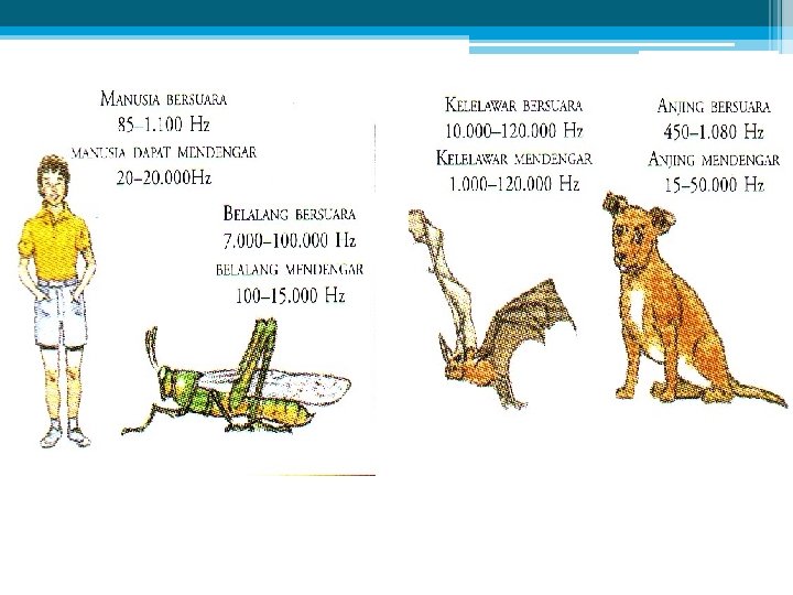 Macam – macam bunyi berdasarkan frekuensinya ØInfrasonik : bunyi yang frekuensinya kurang dari 20 Hz. Bunyi ini bisa didengar oleh jengkerik ØAudiosonik : bunyi yang frekuensinya antara 20 Hz sampai 20. 000 Hz. Bunyi ini dapat didengar oleh manusia ØUltrasonik : bunyi yang frekuensinya lebih dari 20. 000 Hz. Bunyi ini dapat didengar oleh kelelawar, lumba – lumba, anjing, dan kucing.