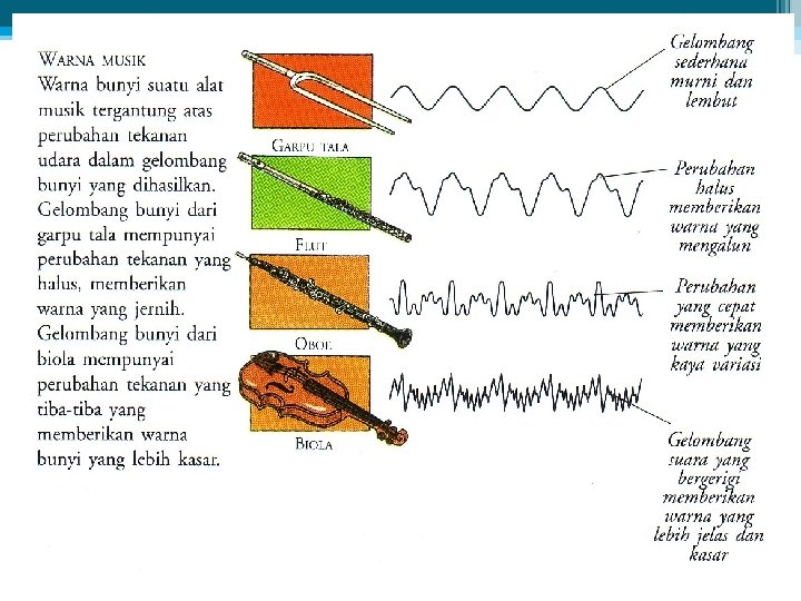 • Apa perbedaan tinggi rendahnya bunyi dengan kuat lemahnya bunyi? • Tinggi rendah bunyi bergantung pada frekuensi getaran sumber bunyi • Kuat bunyi bergantung pada besarnya amplitudo