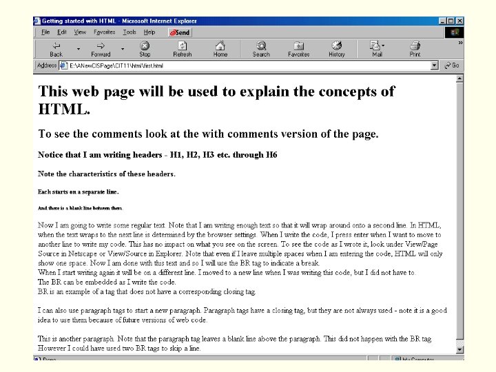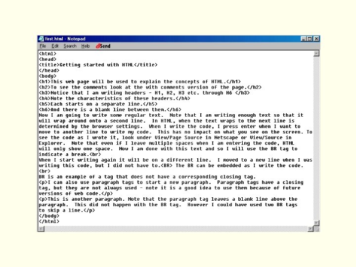 <html> <!--This is a comment tag. I will use this to explain the structure of the code. HTML tags are embedded in the text of the document/web page that you create. The angle brackets < and > surround the markup instructions and make the instruction detectable to the browser when it is showing your page. You start with the word HTML enclosed in < and >. Note the ending comment tag --> <head> <!-- The code can be broken down into two sections: the HEAD and the BODY. Note that the beginning HEAD tag is simply enclosed in angle brackets while the closing head tag uses the angle brackets and a slash: </. For now, the only thing we will put in the HEAD is the TITLE. Note the use of the starting and ending TITLE tags. You will see that most tags use both the start and the end. We will deal with exceptions as the arise. The title will appear in the top left corner of the screen when the browser is displaying the web page --> <title>Getting started with HTML</title> </head> <body> <!-- We are now in the BODY portion of the HTML where most of the code is written. Note at the end of the code, I close the BODY and finaly close the HTML. --> <h 1>This web page will be used to explain the concepts of HTML. </h 1> <h 2>To see the comments look at the with comments version of the page. </h 2> <h 3>Notice that I am writing headers - H 1, H 2, H 3 etc. through H 6 </h 3> <h 4>Note the characteristics of these headers. </h 4> <h 5>Each starts on a separate line. </h 5> <h 6>And there is a blank line between them. </h 6>