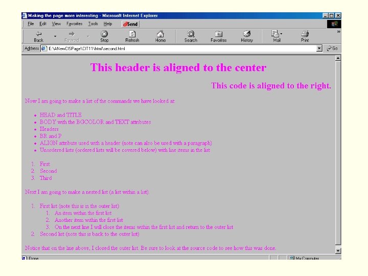 <html> <head> <title>Making the page more interesting</title> </head> <body bgcolor="#C 0 C 0 C 0" text="#FF 00 FF"> <h 1 align=center>This header is aligned to the center</h 1> <h 2 align=right>This code is aligned to the right. </h 2> Now I am going to make a list of the commands we have looked at: <ul> <li>HEAD and TITLE</li> <li>BODY with the BGCOLOR and TEXT attributes</ li> <li>Headers</li> <li>BR and P</li> <li>ALIGN attribute used with a header (note can also be used with a paragraph)</ li> <li>Unordered lists (ordered lists will be covered below) with line items in the list</ li> </ul> <ol> <li>First</li> <li>Second</li> <li>Third</li> </ol> Next I am going to make a nested list (a list within a list). <ol> <li>First list (note this is in the outer list)</ li> <ol> <li>An item within the first list</ li> <li>Another item within the first list</ li> <li>On the next line I will close the items within the first list and return to the outer list</li> </ol> <li>Second list (note this is back to the outer list)</ li> </ol> Notice that on the line above, I closed the outer list. Be sure to look at the source code to see how this was done. </body> </html>