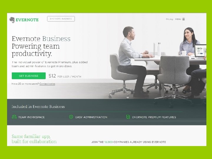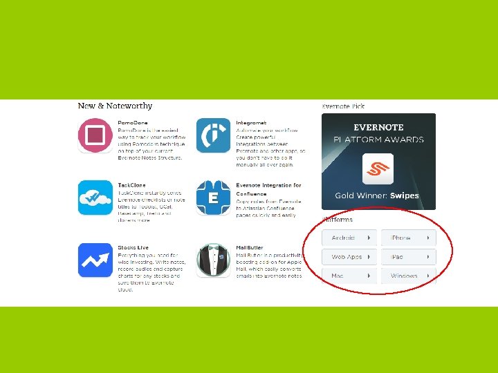 More ideas from library folks • “For taking notes in meetings, annotating articles/PDFs, keeping medical records, recipes, receipts, software licenses. . . “ • “For lots of things! Like a queue for library website slides where staff can check progress on their requests. “ • “So notes, transparency, communication, infosharing, and more. Evernote is almost a second OS to me. “ • “On phone, tablet & PC. For quick idea notes & also longer blog posts/articles. Easy to search through content too. “