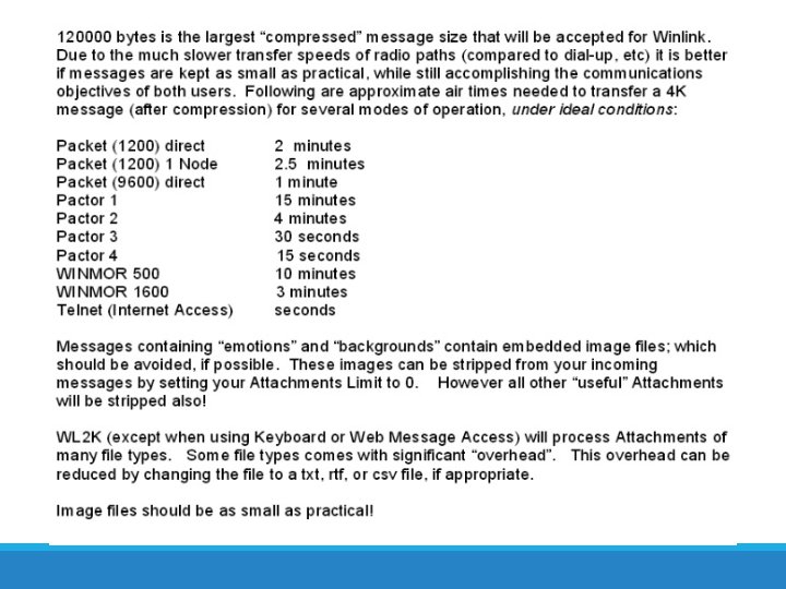 What Winlink Offers for Em. Comm Continued • Bridge different radio capabilities (VHF/UHF/HF) • Bridge protocols: Pactor, Winmor, Ardop, VARA, Packet. • Standard e-mail format with many features • Binary file attachments (pictures, pdf, spreadsheets) • Automatic message compression/decompression • Encrypted attachments using the encryption program you choose. No need to convert to letter groups. • Time independence and frequency agility • Not limited by station-to-station propagation