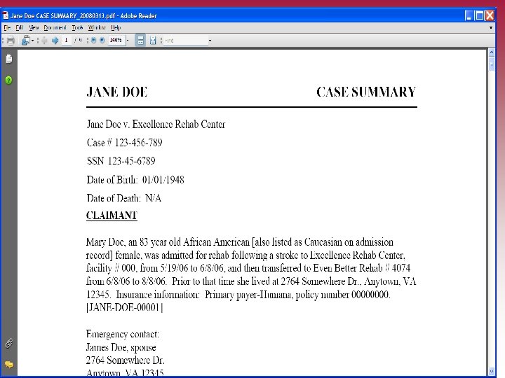 Case Summary • Early Risk Assessment: Narrative review of medical information: • Claimant personal and demographic information • Facility information • Allegations • Medical record analysis (case overview) • Summary of pertinent issues – focused on allegations • Further investigation • Conclusion * Excelas Introduction – Long-Term Care Risk/Legal Committee Meeting
