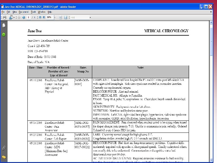 Medical Chronology • Detailed review of all pertinent information found in records • Presented in chronological order • • • Date of event Provider of record Provider of care Record type being reviewed Notes / comments Bates page reference Excelas Introduction – Long-Term Care Risk/Legal Committee Meeting