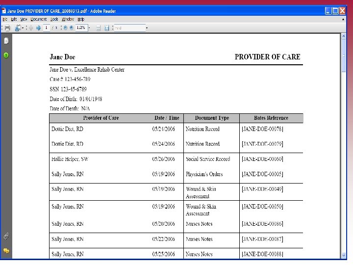 Provider of Care Report • Provides a link to all entries made by an individual provider of care • Available for all providers - or for an individual provider of care • Sorted by: • Date • Document type • Bates number Excelas Introduction – Long-Term Care Risk/Legal Committee Meeting