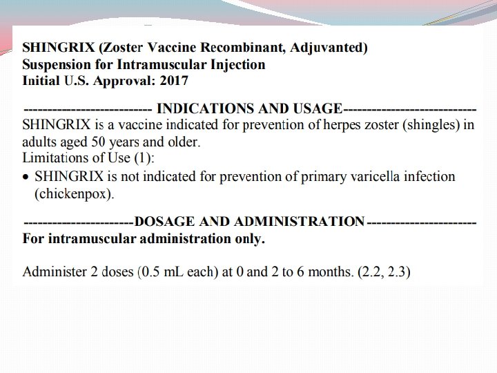 Summary Formulation Storage Administration Efficacy Type Zostavax® Shingrix® Powder for reconstitution Freezer Suspension for reconstitution Refrigerator SQ Single Dose 38 -70% IM 2 doses 90 -97% LIVE INACTIVATED