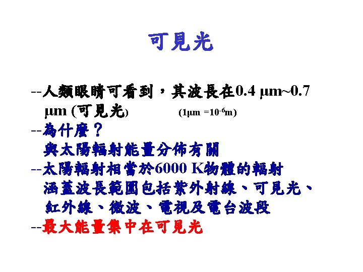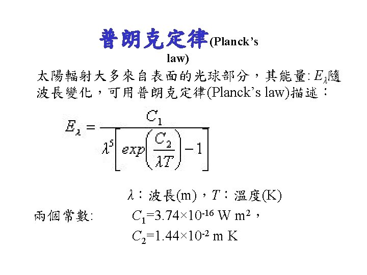 Energy Budget • Sunbeam (1365 -1372 W/m 2) = 100 % at the top of atmosphere – 30 % reflected and scattered back out to space (411 W/m 2) • Earth’s surface (4%) • Clouds (20%) • Atmosphere (6%) – 19 % absorbed by Earth’s atmosphere (260. 3 W/m 2) – 51 % heats Earth’s surface directly (698. 7 W/m 2)