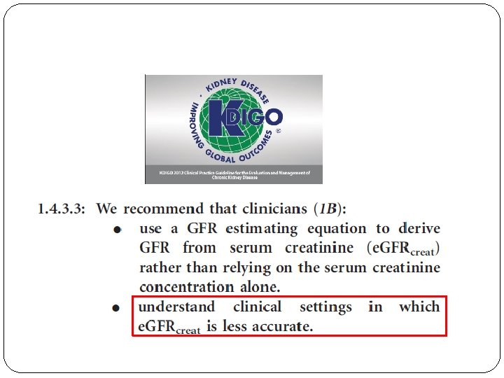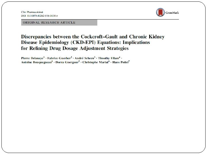 MDRD or CKD-EPI limitations = creatinine Specific population: MDRD and CKD-EPI are not magic!! Keep our clinical feeling!! If creatinine is especially « bad » for reflecting GFR (most of time because abnormal muscular mass), your MDRD result won’t be accurate and the CKD-EPI equation won’t be more precise Anorexia Nervosa (Delanaye P, Clin Nephrol, 2009, 71, 482) Cirrhotic (Skluzacek PA, Am J Kidney Dis, 2003, 42, 1169) Intensive Care (Delanaye P, BMC Nephrology, 2014, 15, 9) Severely ill (Poggio ED, Am J Kidney Dis, 2005, 46, 242) Heart transplanted (Delanaye P, Clin Transplant, 2006, 20, 596) Kidney transplantation (Masson I, Transplantation, 2013, 95, 1211) Obese (Bouquegneau A, NDT, 2013, 28, iv 122) Elderly (Schaeffner E, Ann Intern Med, 2012, 157, 471) Hyperfiltrating (Gaspari F, Kidney Int, 2013, 84, 164)