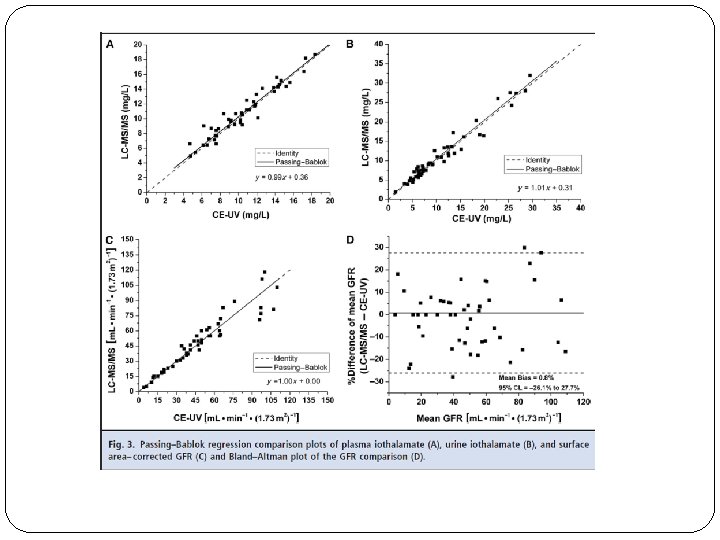 Plasma versus Urinary clearances n Bias ml/min/1. 73 m² (%) Precision (SD) (ml/min/1. 73 m²) T 2 -T 4 342 +10 (+27%) ± 6 T 2 -T 6 342 +8 (+21%) ± 6 T 2 -T 24 215 +3 (+8. 8%) ± 5 Stolz A, Transplantation, 2010, 89, 440
