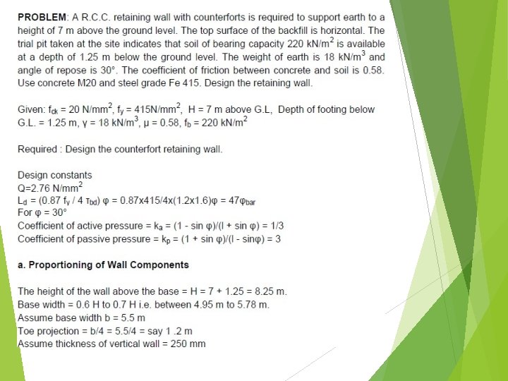 Details of wall 250 mm CF: 3 m c/c, 400 mm h 1=7 m h=7. 8 m H=8. 25 m d 1. 25 m T 1. 2 m 4. 05 m θ b=5. 5 m 14