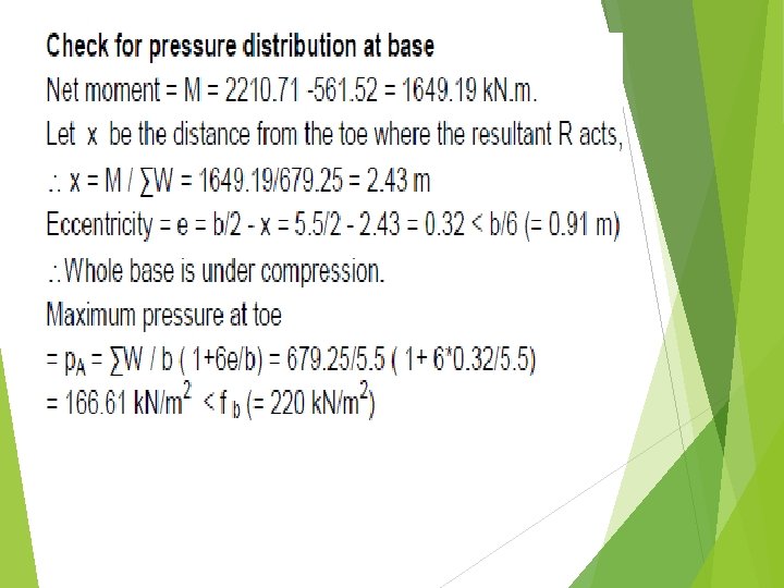 b. Check Stability of Wall Loads in k. N Dist. of e. g. from T in m Moment about T in k. N-m Weight of stem W 1 25 x 0. 25 x 1 x 7. 8 = 48. 75 1. 2 + 0. 25/2 =1. 325 64. 59 2 Weight of base slab W 2 25 x 5. 5 x 1 x 0. 45 = 61. 88 5. 5/2 =2. 75 170. 17 3 Weight of earth over heel slab W 3 18 x 4. 05 x 1 x 7. 8 = 568. 62 1. 45 +4. 05/2 = 3. 475 1975. 95 Sr. No. Description of loads 1 Total ΣW =2210. 71 ΣW = 679. 25 15