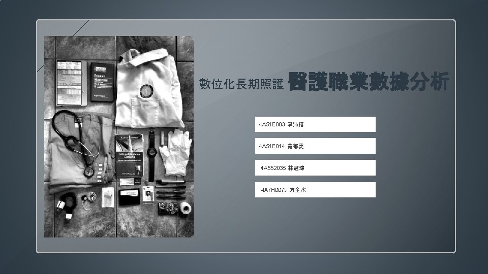 數位化長期照護 醫護職業數據分析 ggplot(hospital, aes(reorder(地區, -家數 /sum(家數)), (家數/sum(家數)) * 100 )) + geom_bar(stat="identity", fill= 'blue')+ theme(axis. text. x = element_text(angle = -90, vjust=0, hjust=1))+ ggtitle('106年各縣市醫院家數比例')+ theme(plot. title = element_text(hjust = 0. 5, size = 20, face = "bold", colour='red'))+ labs(x='縣市', y='百分比')+ theme(axis. text. y = element_text(vjust=0. 5, hjust=1, colour=' green'))+ theme(axis. title. x = element_text(face = "italic", color = "rosybrown"))+ theme(axis. title. y = element_text(face = "bold. italic", color = "royalblue"))