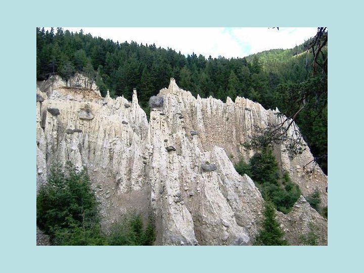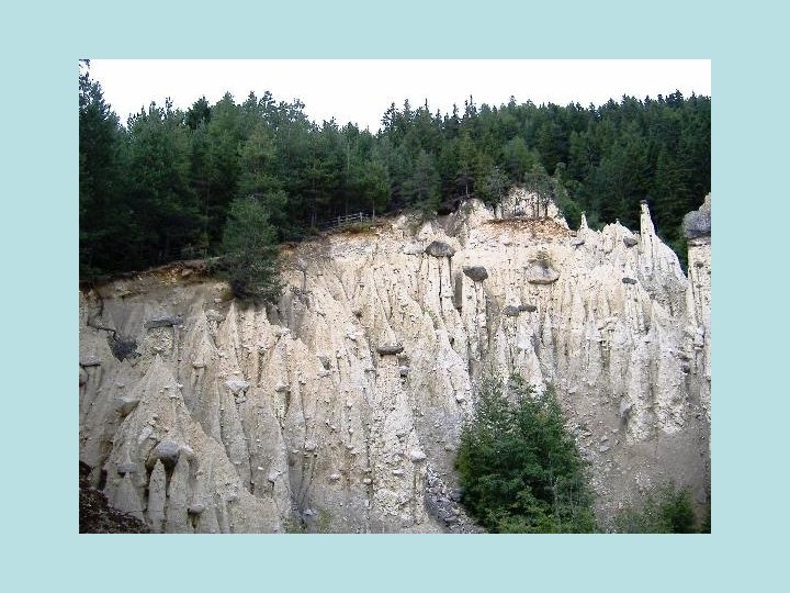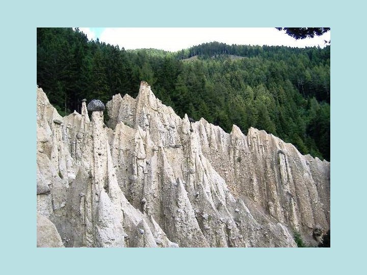 Piramidi di terra o di erosione Sabbia, argilla, marna, ciottoli, blocchi compatti mescolati e debolmente cementati: depositi morenici: i ciottoli e i blocchi sovrastanti i materiali più fragili li proteggono dalla azione diretta, disgregatrice della pioggia