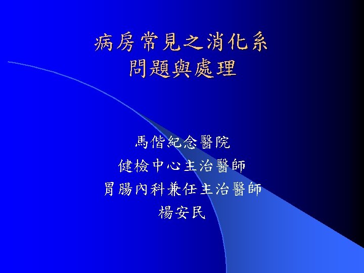 消化道出血的間接症狀: dizziness , fainting, tachycardia, cold sweating, shock, abdominal fullness, poor appetite, cons. change l 一旦懷疑, 利用vital sign評估出血量最重耍 (occult bleeding or overt bleeding) l – Orthostatic hemodynamic change – 10 to 20% blood loss l Drop in systolic pressure > 10 mm. Hg, raise in pulse rate >15/min – Supine hypotension – greater than 20% blood loss 定位 UGI or LGI 同時評估 medical treatment or surgical treatment l GI bleeding vs Non-GI bleeding: 吐血 vs. 咳血 vs. internal bleeding l