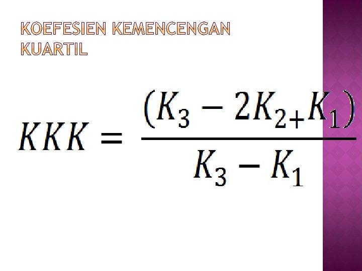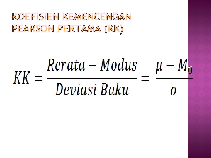 � Jika rerata = modus maka KK = 0 merupakan distribusi yang simetris sempurna � Jika rerata > modus maka kk > 0, koefisien kemencengan pearson positif (menceng ke kiri) � Jika rerata < modus maka kk < 0, koefisien kemencengan pearson negatif (menceng ke kanan)