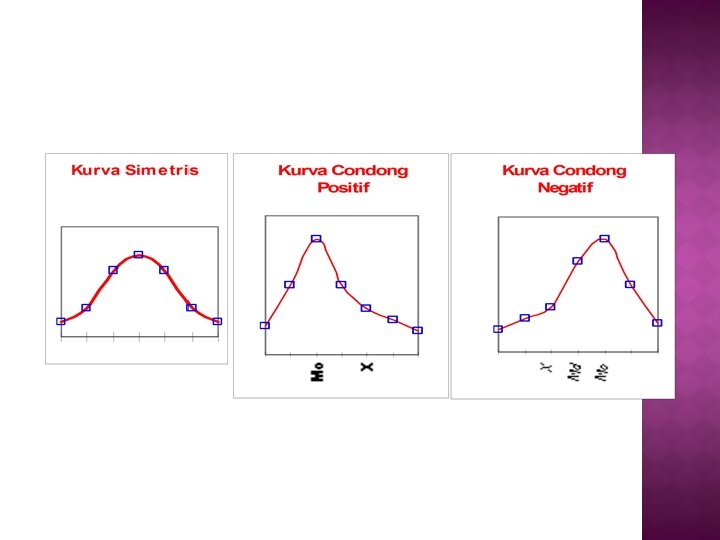 � Leptokurtis yaitu suatu distribusi yang berpuncak tinggi dan ekor-ekornya relatif panjang � Platikurtis yaitu suatu distribusi yang puncaknya agak mendatar dan ekor-ekornya relatif pendek � Mesokurtis yaitu suatu distribusi normal yang puncaknya tidak begitu tinggi dan tidak begitu mendatar