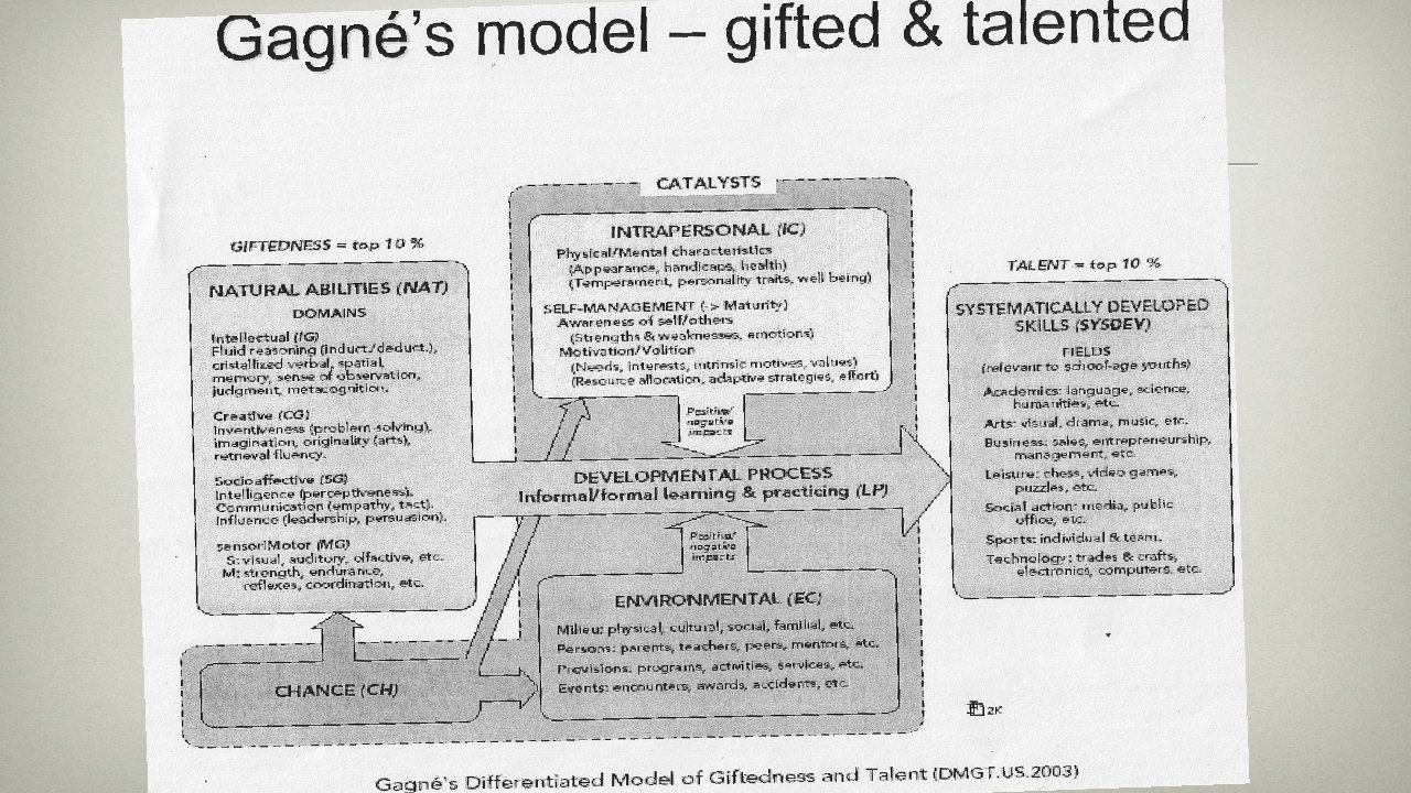 Our school policy • It is our professional obligation to provide a learning climate/experience that effectively supports the individual requirements of every student. • Policy was developed to meet the learning and social/emotional needs of gifted students as they have the potential for unusually high performance in at least one area. They are an extremely diverse group with unique characteristics and educational needs. • School’s policy is one of programming for gifted learners rather than a “Gifted Programme” • Uses Gagne Differentiated model of Giftedness and Talent. (2003) Top 10% • Gift-natural abilities/aptitudes significantly beyond same aged peers with outstanding potential • Talent-demonstrated achievement/performance significantly beyond same aged peers.