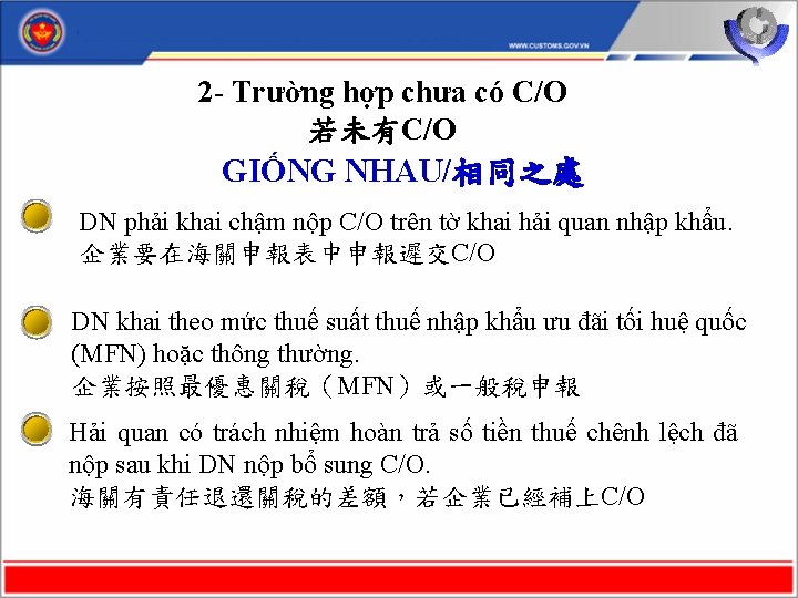 4 - Hiệu lực thi hành 有效期 Thông tư 47/2020/TT-BTC được ban hành ngày 27 tháng 5 năm 2020 có hiệu lực áp dụng cho các tờ khai hải quan nhập khẩu đăng ký từ ngày 23/1/2020. 通 知 號 47/2020/TT-BTC的 通 知 于 2020年 5月 27日 起 效 。 對 2020/1/23日登記的申報表起效。