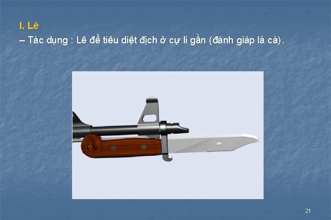 1, Tác dụng, tính năng chiến đấu a. Tác dụng -Súng AK là loại tự động nạp đạn theo nguyên lí tríchkhí thuốc qua thành nòng súng, súng bắn được liên thanhvà phát một, nhưng chủ yếu bắn liên thành. -Súng trang bị cho từng người sử dụng, dùng hỏa lực để tiêudiệt sinh lực địch, súng. Súng có lê đánh gần 6