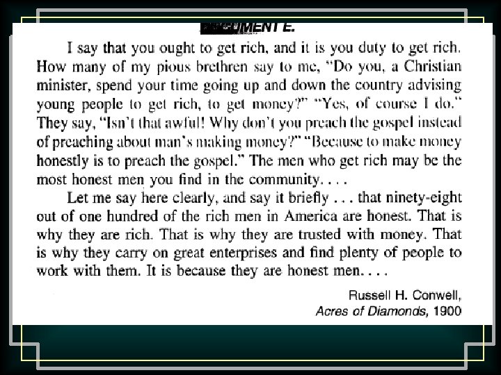 Religion in the Era of Industrialization $ Wealth no longer looked upon as bad. $ Viewed as a sign of God’s approval, the Protestant (Puritan) Work Ethic $ Christian duty to accumulate wealth. Russell H. Conwell