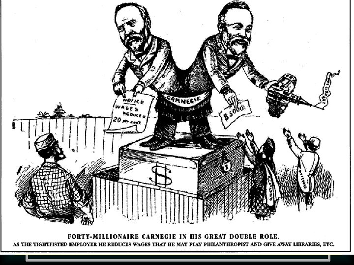 The Gospel of Wealth: Andrew Carnegie $ “On Wealth, ” 1889 Andrew Carnegie article $ “Inequality is inevitable and good. $ Wealthy should act as “trustees” for their “poorer brethren. ” God given responsibility $ “The man who dies rich dies disgraced. ” $ Philanthropy, Gave away $350 Million