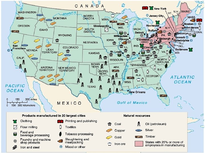 American Industrial Expansion ► With the completion of Manifest Destiny throughout continental U. S. , the nation encompassed near-perfect elements for massive industrialization and economic expansion ► Economic Resources § Land ► Abundance and discovery of vast deposits of coal, iron ore, copper, timber, oil, gold, silver, agricultural § Labor ► Cheap wages, immigration, population growth § Capital ► Industrial capitalism and finance capitalism ► Federal subsidies and land sales ► Second Industrial Revolution and technological innovation § Entrepreneurial Ability ► Captains of Industry/Robber Barons