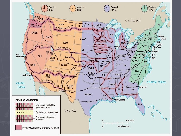 Railroads Drive the Economy ► Growth and Influence § 35, 000 miles (1865) to 200, 000 miles (1900) § First Transcontinental Railroad (1869) ► Leland Stanford’s Union Pacific and Central Pacific meet at Promontory Summit, UT § Market connections, boomtowns, and jobs ► Federal Government Involvement § Pacific Railway Acts ► Land grants and government bonds to railroad companies ► Requirement of standardized gauges § By 1871, federal and state governments sold 300, 000 acres of land to railroads ► Innovation and Improvement § § Standardized gauges Westinghouse air brakes Steel Time zones