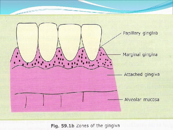 Gingiva is a masticatory type of oral mucous membrane, forms the covering of the teeth. 3 parts: Marginal gingiva. Attached gingiva. Interdental gingiva