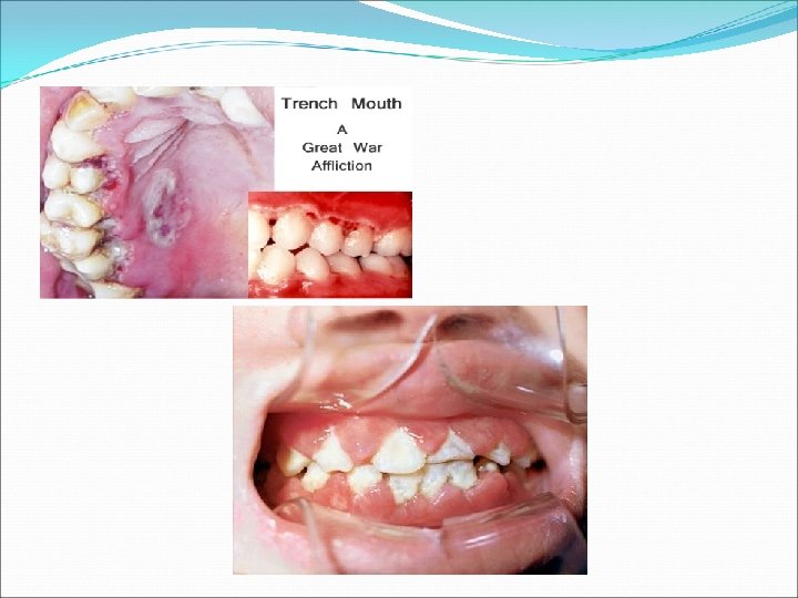 Acute necrotising ulcerative gingivities: Trenchmouth, vincent’s angina or stomatitis. Etiology: -Fusiform bacilli, spirocheates. Local factors-over hangingrestoration, malocclusion. Systemic factors-stress. Nutritional deficiency-Vitamin. B , Vitamin. C. Debilitating diseases. Down’syndrome, AIDS, diabetes