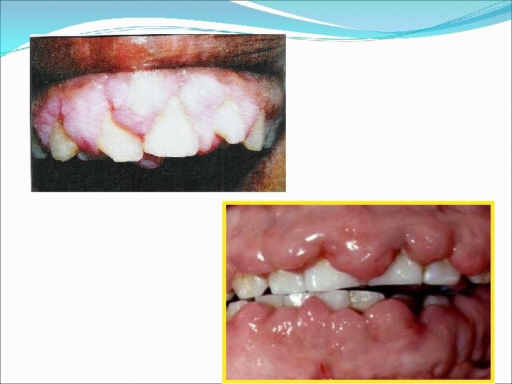 Drug induced gingival hyperplasia: Phenytoin, cyclosporine, nifedipine. c/f: 2 -3 weeks after initiation of phenytoin therapy. Painless enlargement of interproximal gingiva. Buccal and ant. segment more than lingual and posterior.