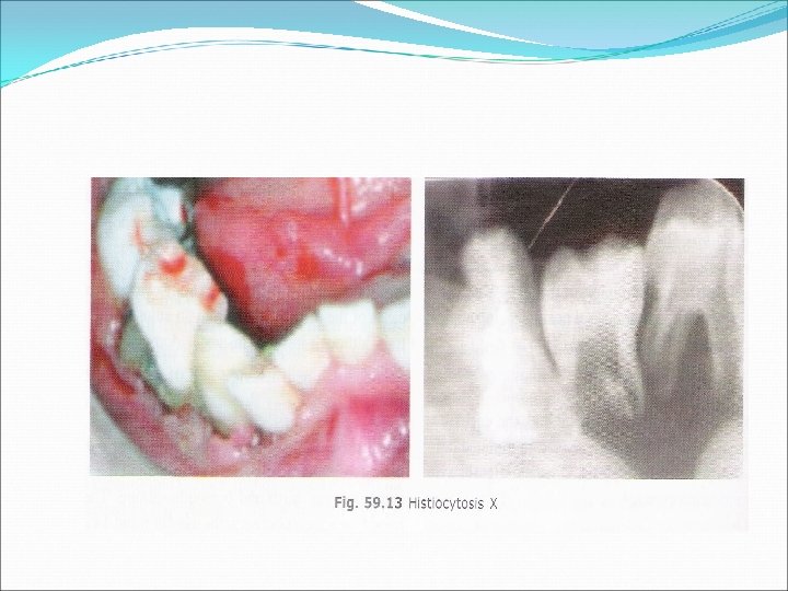 Langerhans cell histiocytosis: -(H. X) Results from disturbances in immunoregulation. Proliferation &dissemination of histiocytecells of Langerhans system Clinical features: Ulcerative necrotizing lesions of gingiva, root exposure, increased mobility of the teeth, halitosis. R/f: -floating teeth. -distruction of alvelor bone