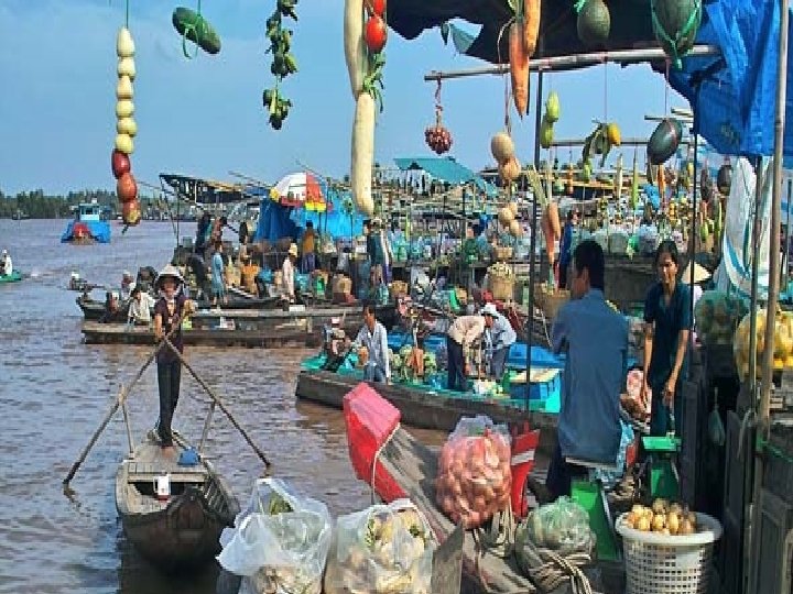 Trù phú, đông vui: + Hµng ho¸ phong phó, thuyÒn bÌ san s¸t, những ®èng gç cao nh nói, những bÕn vËn hµ nhén nhÞp däc dµi theo s «ng, những ng «i nhµ bÌ ban ®ªm ¸nh ®Ìn măng s «ng chiÕu rùc trªn mÆt n íc. Đéc ®¸o + Chî chñ yÕu häp ngay trªn s «ng n ícvíi những nhµ bÌ nh những khu phè næi vµ những con thuyÒn b¸n hµng len lái mäi n¬i, cã thÓ mua mäi thø mµ kh «ng cÇn b íc ra khái thuyÒn. +Sù ®a d¹ng vÒ mµu s¾c, trang phôc, tiÕng nãi cña ng êib¸n hµng thuéc nhiÒu d©n téc : Ng êi. Hoa, ng êi Miªn, Chµ Ch©u Giang …