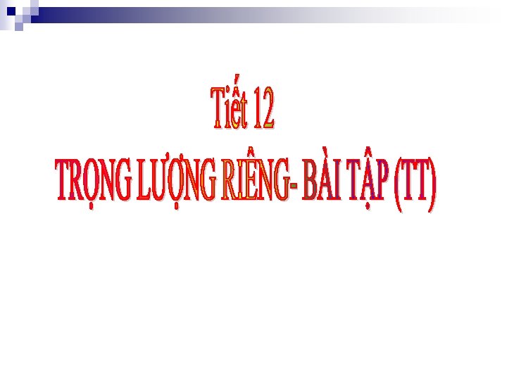 Tiết 12: TRỌNG LƯỢNG RIÊNG – BÀI TẬP B¶ng trọng lưîng riªng cña mét sè chÊt B¶ng khèi lưîng riªng cña mét sè chÊt ChÊt r¾n Khèi l îng riªng (kg/m 3) ChÊt láng Khèi l îng riªng (kg/m 3) Ch× 11300 Thuû ng©n 13600 S¾t 7800 N íc 1000 Nh « m §¸ G¹o Gç tèt 2700 x¨ng (kho¶ng) DÇu ho¶ 2600 700 (kho¶ng) 800 (kho¶ng) DÇu ¨n 1200 800 (kho¶ng) R îu, cån 800 (kho¶ng) 790 ChÊt r¾n Träng l îng riªng (N/m 3) ChÊt láng Träng l îng riªng (N/m 3) Ch× 113000 Thuû ng©n 136000 S¾t 78000 N íc 10000 Nh « m 27000 x¨ng 7000 (kho¶ng) DÇu ho¶ (kho¶ng) §¸ G¹o Gç tèt 26000 (kho¶ng) 12000 (kho¶ng) 8000 DÇu ¨n R îu, cån 8000 (kho¶ng) 7900