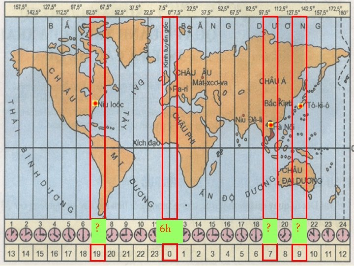 HOẠT ĐỘNG NHÓM (2 bạn/nhóm – 3 phút) Ví dụ 1: Một trận bóng đá quốc tế diễn ra ở Pari vào lúc 17 h ngày 17/10/2014, vậy ở Hà Nội muốn xem trận bóng đá đó phải bật tivi ngày nào và mấy giờ (Hà Nội có múi giờ số 7)? Ví dụ 2: Nếu ở Luân Đôn đang là 6 h thì lúc đó ở Hà Nội, Tokyo và Niu. Iooc là mấy giờ? (biết múi giờ lần lượt là Hà Nội: 7; Tokyo: 9; Niu. Iooc: -5)