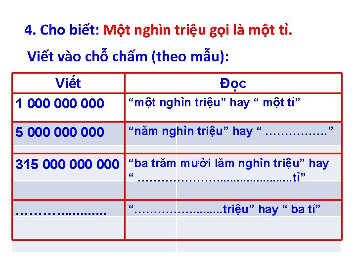 1. Viết các số sau: a/ Một trăm bảy mươi chín triệu hai trăm ba mươi lăm nghìn năm trăm. b/ Bốn trăm năm mươi bảy triệu không trăm ba mươi mốt nghìn hai trăm linh năm. 2. Đọc số và nêu giá trị của số 6 trong số sau: 45 631 243