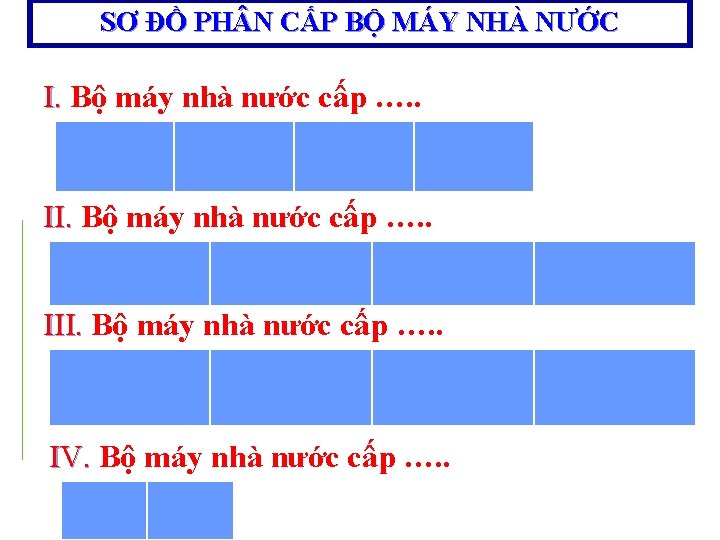 SƠ ĐỒ PH N CẤP BỘ MÁY NHÀ NƯỚC I. Bộ máy nhà nước cấp trung ương Quốc hội Toà án ND Chính phủ tối cao II. Bộ máy nhà nước cấp tỉnh HĐND tỉnh (thành phố) UBND tỉnh (thành phố) Viện kiểmsát ND tối cao ( thành phố thuộc trung ương) Toà án ND tỉnh ( thành phố) Viện kiểmsát ND tỉnh (thphố) III. Bộ máy nhà nước cấp huyện (quận, thị xã, thành phố thuộctỉnh) Viện kiểm sát ND HĐND huyện UBND huyện Toà án ND huyện (quận, thị xã) IV. Bộ máy nhà nước cấp xã ( phường, thị trấn) HĐND xã ( phường, thị trấn) UBND xã ( phường, thị trấn) (quận, thị xã) huyện (quận, thị xã)