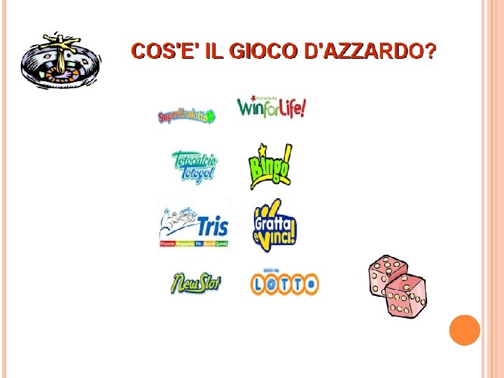 ALCUNI ESEMPI DI GIOCHI D'AZZARDO Dadi, carte Scommesse sportive Giochi sportivi (schedine Totocalcio, Totogol, . . . ) Lotto, Enalotto, Superenalotto, Lotterie, Gratta e vinci Slot machines/new slot/videopoker Casinò (roulette, black jack, . . ) Bingo Cyber-azzardo: scommesse on line, casinò virtuali