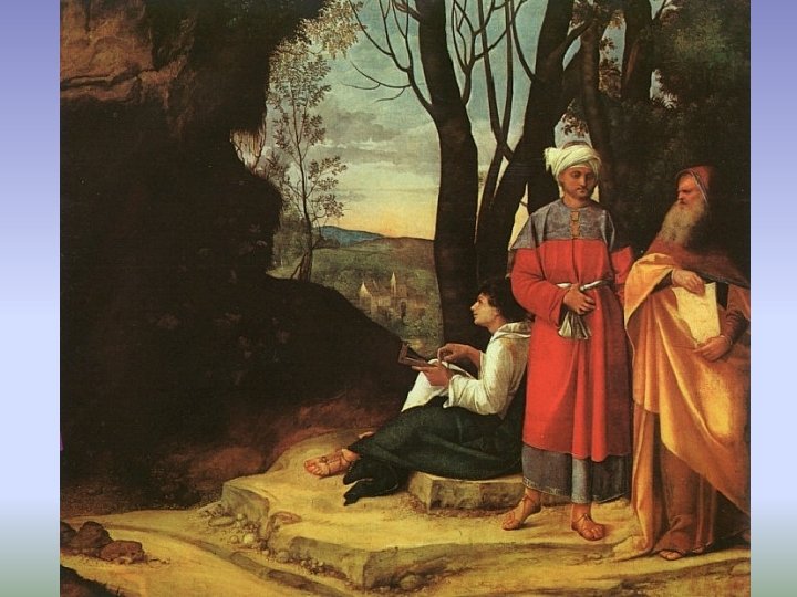 A három filozófus A kép három gondolkodót ábrázol, egy fiatalt, egy középkorút és egy időset, szemben egy barlanggal. Egyik asztrológiai témájú feljegyzést tart a kezében, a fiatalnál valamilyen mérőeszköz van. Figyelemmel vagy elmerengve tekintenek valamilyen irányba. Újabb talányos kép, amihez a témán kívül a története is hozzájárult. Egy 1569 es jegyzékben „A három matematikus”, 1783 -ban „A háromkirályok a csillag feltűnését várják” címen említik. Újabb és újabb értelmezések láttak napvilágot, volt, aki szerint a kép szereplői az ókort, a középkort és az újkort szimbolizálják, más szerint a kép Marcus Aureliust és két filozófusát ábrázolják, és még egy értelmezés: a fiatal férfi a reneszánszt, a turbános az arab filozófiát, az öreg pedig a középkori gondolkodást jeleníti meg. A kép 1659 -ben Habsburg Lipót Vilmos főherceg tulajdona volt, innen került az osztrák császári gyűjteménybe, majd a bécsi Kunsthistorisches Museumba, jelenlegi helyére. A vászonra készült kép – Giorgione festményeinek általában viszonylagosan kis méretéhez képest – eléggé nagy, 123, 5× 144, 5 cm. Keletkezési idejét – bizonytalanul – 1507– 1508 körülire lehet tenni. Morelli szerint a festményt Giorgione tanítványa, Sebastiano Luciani (vagy ismertebb nevén Sebastiano del Piombo) fejezte be.
