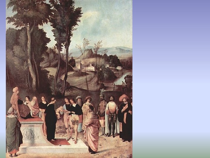 Mózes tűzpróbája A kép a gyermek Mózes történetét meséli el, aki véletlenül leverte a fáraó koronáját. A tűzpróbával azt akarták kideríteni, hogy milyen szándék vezette a gyermeket. A történet szerint Mózes a két tál közül az izzó szenet választja, kivesz egyet és a szájába kapja. Megégeti a nyelvét, és emiatt beszédhibás lesz egész életében. A festmény bal oldalán, egy emelvényen ül a fáraó, előtte a gyermek éppen elveszi az izzó szenet. A jelenetet egy csoport figyeli az emelvény körül. A háttér részletesen kidolgozott festői táj, ami néhány magas fa mellett válik láthatóvá. A hangulatos hátterek, a szép és részletes tájak Giorgione több más képére is jellemzők, amik igazából csak az életnagyságú képeken mutatkoznak meg. A festmény valószínűleg egyike Giorgione első önálló alkotásainak, Scharten-Antink ennek megfelelően 1498– 1500 körüli időre datálja. A festményt 1692 -ben a toszkán nagyhercegnő tulajdonában említették, majd – több más Giorgione festménnyel együtt – megkezdte „kálváriáját”: elfeledkeztek róla, és 1792 -ben már mint Giovanni Bellini műve került az Uffizibe. A mai álláspont szerint természetesen Giorgione alkotásáról van szó, de néhányan más festők közreműködését (Campagnola, Catena) is feltételezik. Különösen a jobb oldali csoport alakjainál vélnek felfedezni más festő keze nyomát. Ugyanakkor azt sem zárják ki, hogy a különbözőséget a későbbi restaurálások okozzák. A kép mérete 89× 72 cm, és a firenzei Uffizi képtárban látható.