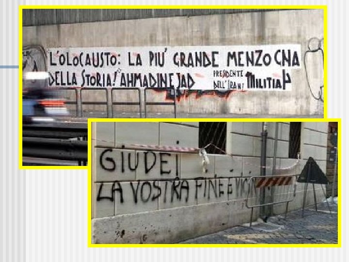 Crimini puniti dalla legge italiana l’imposizione di marchi e distintivi a persone appartenenti ad un gruppo nazionale, etnico, “razziale”o religioso, indicanti l’appartenenza al gruppo stesso; l’istigazione o l’apologia al genocidio; la propaganda in qualsiasi modo di idee fondate sulla superiorità o l’odio “razziale” o etnico; la commissione di o l’istigazione a commettere atti di discriminazione o violenza fisica per motivi razziali, etnici, nazionali o religiosi; la costituzione di organizzazioni, associazioni, movimenti o gruppi aventi tra i propri scopi l’incitamento alla discriminazione o alla violenza per motivi “razziali”, etnici, nazionali o religiosi; la manifestazione o l’ostentazione, in pubbliche riunioni, di emblemi o simboli propri o usuali delle organizzazioni, associazioni, movimenti o gruppi che incitano all’odio o alla discriminazione “razziale”; l’esaltazione pubblica di esponenti, principi, fatti o metodi del fascismo quando il fatto riguarda idee o metodi razzisti.