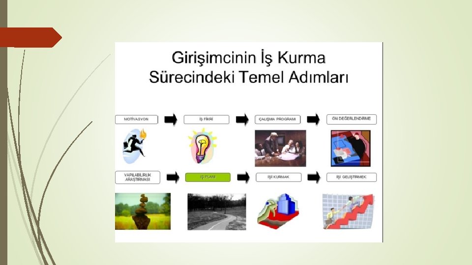 İş Kurma Motivasyonu Motivasyon girişimci kişiye, önemli bir kişisel dinamizm kazandırır. Kişi kurarken, kendinin patronun olmak, mevcut iş seçeneklerinin verebileceği maddi-manevi kazanımlardan daha fazlasına ulaşma isteği, kendi işini kurmak dışında kendi hayatını kazanma seçeneklerinin sınırlı olması gibi motivasyon bulur. İyi bir iş plan, başarılı bir girişimin ilk adımıdır. İş planına önce yüksek motivasyon ile başlamak, işin olacağına dair derin bir inanç taşımak gerekir.