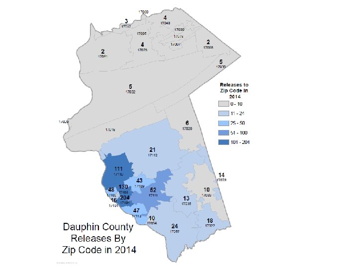 Data • Committing County 4 Proxy for county of residence, NOT the same as county of residence è 2 years of releases (2014 -2015) èAllegheny County (Pittsburgh) – 3, 859 legal or notify zip code – 2, 458 Allegheny committing county – 64% èPhiladelphia County (Philadelphia) – 10, 639 legal or notify zip code – 7, 567 Philadelphia committing county – 71% – 1, 861 Mont. Co, Del. Co, Bucks. Co – 89%