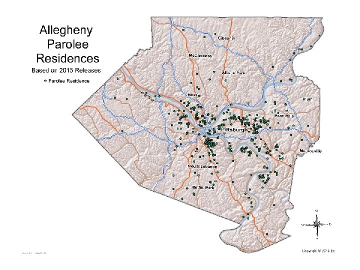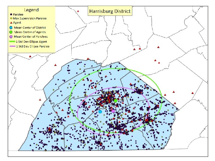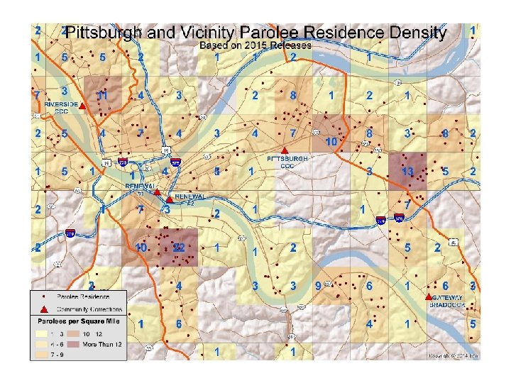 Data • Inmate/parolee address data: 4 Collected at intake/classification 4 Inmate “Legal Address” 4 Inmate “Notify Address” 4 address 1, address 2, city, state, zip 4 NOT verified èaddress = “mom’s house”, “Harrisburg CCC” èPhiladelphia = Phi, Phila, Philal, Phily, Philly, Phla, Phialdelphia, Philaedlphia 480 -90% match w/ cleaning