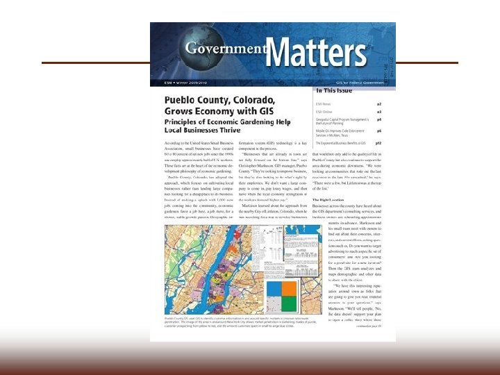 Analysis u u u u Know thyself! Identify under-served markets Find potential development sites Identify areas in need of redevelopment Overlay projects with other activities to avoid conflicts Make better informed decisions Cluster projects Identify labor pool